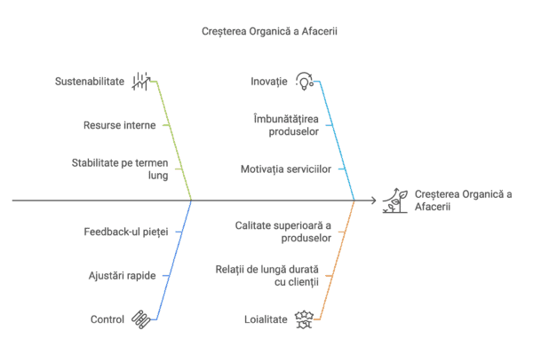 Crescand organic vei avea mai mult control asupra dezvoltarii afacerii, mai multe oportunitati de a crea o cultura solida a afacerii si de a construi relatii puternice cu clientii.